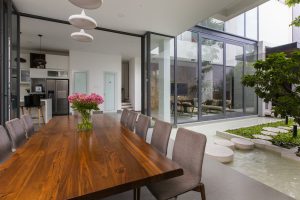 Nép vào nhà hàng xóm để tránh nắng Tây, đồng thời ẩn dưới mái lam...