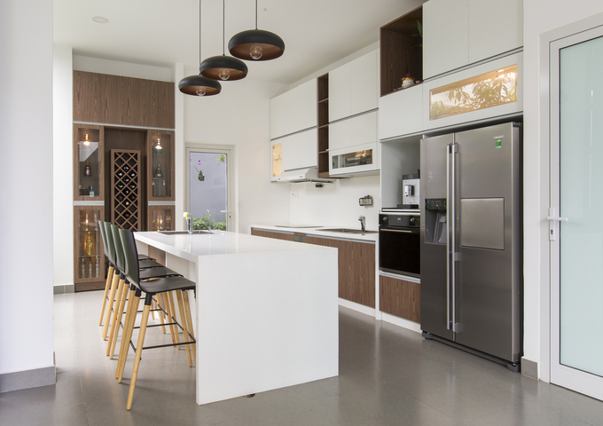 Khi không muốn ngồi ngoài hiên, gia chủ có thể thưởng thức bữa ăn ngay tại quầy bar nhà bếp.