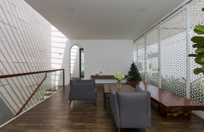 Thay vì dùng kính, các bức tường ở lầu trên cùng, nơi có không gian thờ tự và một không gian sinh hoạt chung, sử dụng lưới thép với hoa văn thiền định.” />Thay vì dùng kính, các bức tường ở lầu trên cùng, nơi có không gian thờ tự và một không gian sinh hoạt chung, sử dụng lưới thép với hoa văn thiền định.